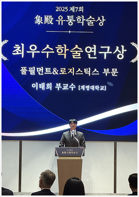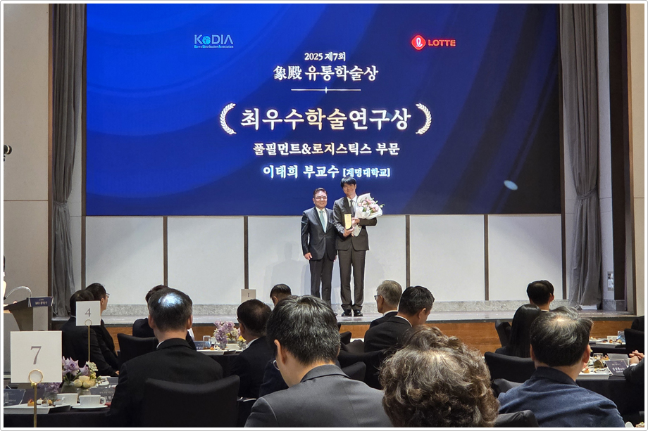 계명대학교 국제통상학과 이태희 교수가 11월 19일(수) 서울 송파구 시그니엘 서울에서 열린 ‘제7회 상전유통학술상’ 시상식에서 물류부문 최우수상을 수상했다. 롯데 유통군과 한국유통학회가 공동 주관한 이번 시상식은 유통학계 우수 연구자를 발굴하고 지원하기 위해 2019년 제정된 국내 유일의 유통분야 학술상으로, 고(故) 신격호 롯데그룹 창업주의 호(상전·象殿)를 따 명명됐다. 이날 행사는 유통산업 연구 성과가 산업 현장 혁신으로 이어지는 학술 생태계 조성을 목표로 열렸다.