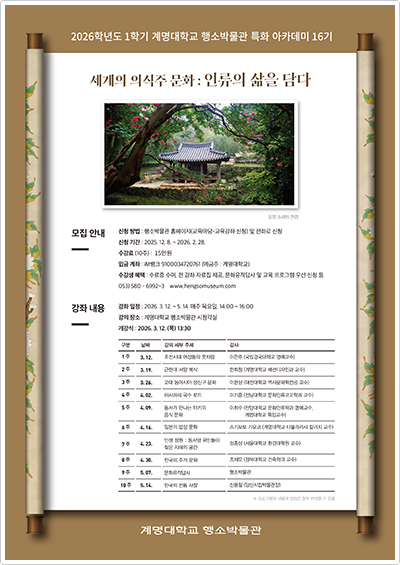계명대학교 행소박물관 박물관대학이 2026학년도 1학기 박물관 특화 아카데미 ‘세계의 의식주 문화’를 주제로 한 인문 강좌를 운영한다. 이번 강좌는 패션사, 고고학, 문화인류학, 환경조경, 건축사 등 다양한 분야의 전문가들이 참여해 의식주를 둘러싼 인류 문화의 흐름과 의미를 입체적으로 조명하는 것이 특징이다.