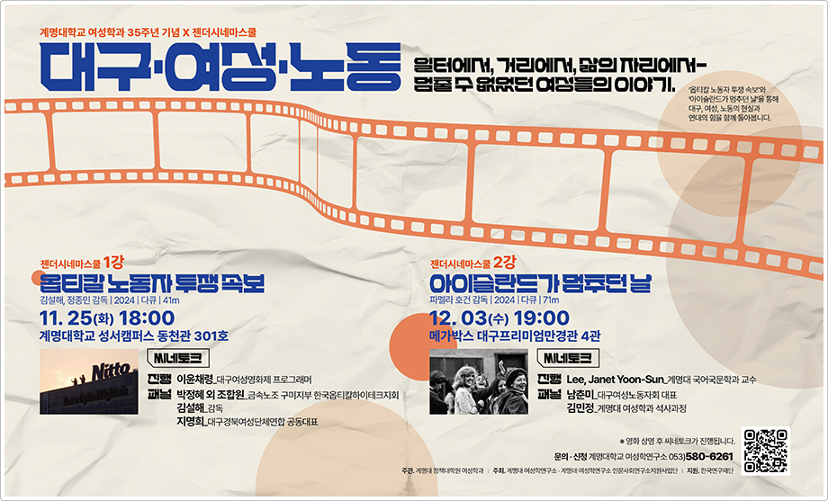 계명대학교 여성학과와 여성학연구소가 여성학과 35주년을 기념해 대구 지역 여성 노동의 현실을 조명하는 상영 프로그램 ‘젠더시네마스쿨’을 연다. 이번 행사는 두 편의 다큐멘터리 상영과 전문가·활동가가 참여하는 씨네토크로 구성됐으며, 여성 노동의 역사와 현재를 지역사회와 함께 성찰하는 장을 마련했다.