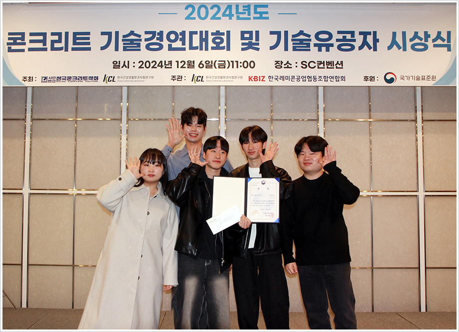 계명대학교 토목공학과 학생들로 구성된 BOL5팀(박찬용, 박규관, 김민각, 최현준, 조은지)이 한국건설생활환경시험연구원(KCL)이 주관한 '2024년도 콘크리트 기술경연대회'에서 산업통상자원부장관상을 수상했다. 시상식은 12월 6일(금) 서울 역삼동 SC컨벤션센터에서 열렸다.